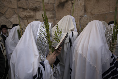 Coberto em xales de oração, judeus ultra-ortodoxos da casta sacerdotal Cohanim participar de uma bênção durante Sucot diante do Muro das Lamentações |