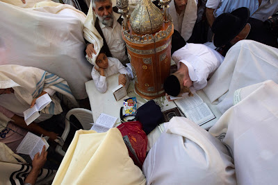 Adoradores judeus cercam um rolo da Torá como eles participarem de a bênção sacerdotal no Muro das Lamentações, local mais sagrado do judaísmo oração, na Cidade Velha de Jerusalém. |
