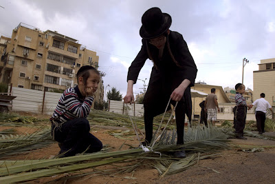 Uma criança judia ultra-ortodoxa anda sobre folhas de palmeira que serão usadas para construir uma cabana Sucá, no bairro Mea Shearim em cerimônicas religiosas de Jerusalém. Os ramos de palmeira são usadas como o telhado de uma casa temporária chamada "Sukkah", que é construída e habitada em durante o feriado de uma semana judaica de Sucot. |