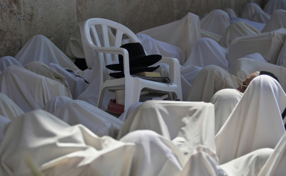 Coberto em xales de oração, judeus ultra-ortodoxos da casta sacerdotal Cohanim participar de uma bênção durante Sucot diante do Muro das Lamentações |
