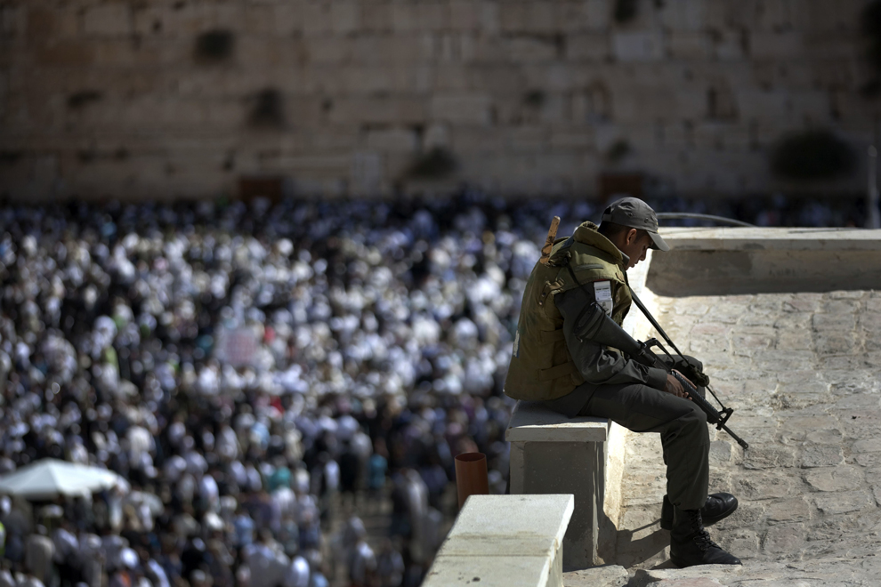 Um guarda de fronteira israelense assegura que a área com milhares de homens e mulheres judeus participem de uma oração em massa Cohanim (bênção sacerdotal), durante o festival peregrinação anual de Sucot no Muro das Lamentações na Cidade Velha de Jerusalém. Milhares de judeus fazem a peregrinação de uma semana para Jerusalém durante o feriado que comemora a peregrinação dos israelitas no deserto após o êxodo do Egito. |